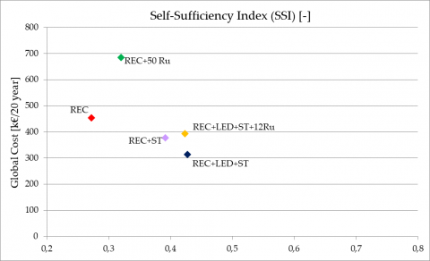Results of energy performance (SCI and SSI) and economic performance (energy cost and payback times) report the REC+ST and REC+LED+ST, as best scenarios. The choice between the two can be made considering the economic convenience (lower Global Cost) in ensuring the energy supply to the REC members (higher SSI, Figure 10a) and the environmental sustainability (lower GHG emission, Figure 10b). Combining energy efficiency intervention and subsequently dimensioning the energy production and storage systems (REC+LED+ST), offers the highest level of energy independence and greater economic benefits: high investment costs are repaid over time. REC+LED+ST+12Ru ensures the supply of the largest number of users maintaining similar levels of energy, economic and environmental performance.