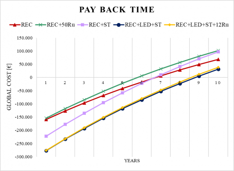 The most economically advantageous scenario is the REC+50 Ru (6 years), this because CSC is maximized and so the incentives (Figure 9). REC scenario is also very advantageous (7 years), while the REC+ST has a high economic return but given the higher investment, it takes 7 years to return it. The REC+LED+ST leads a quite consistent investment cost and so more time to return it (9 years), and it is in line with the REC+LED+ST+12Ru scenario.