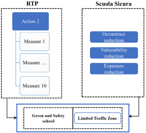 RTP measures, described in previous section, are complementary to Scuola Sicura program because they are oriented towards city sustainability. RTP wants to carry out sustainable mobility interventions that also include those to ensure road safety to pedestrians by controlled areas. Scuola Sicura wants to guarantee the sustainability of buildings with interventions to reduce the risk for students, teachers and employees. Then, RTP and Scuola Sicura are oriented to reduce the risk and to guarantee safety outside and inside school, and to pursue environmental sustainability [54], in this way constitute a specific background to Green and Safety School, as reported in Figure 3.