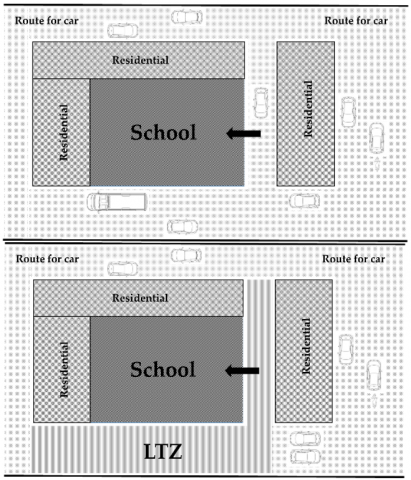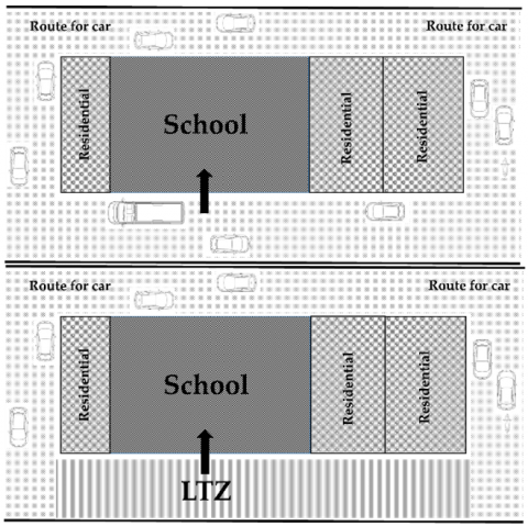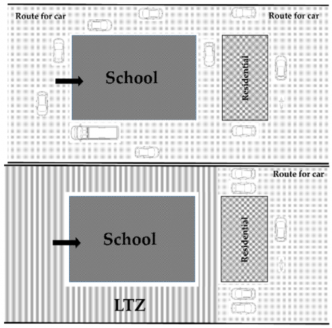 The significance and contribution of this work is to propose a strategy for sustainable mobility as solution to common problem of safety and green near school improving, in the same time, the other components of sustainability. It can be noted that usually LTZ is used in downtown areas to organize traffic flows in commercial zones.