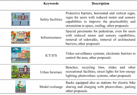 Actions similar to the pedestrian [24] are indicated for bike mode [25], to identify different cycle infrastructures and to encourage the use of the bike, and for foot and bike way, to realize integrated itineraries directly with the collective transport to improve user safety.