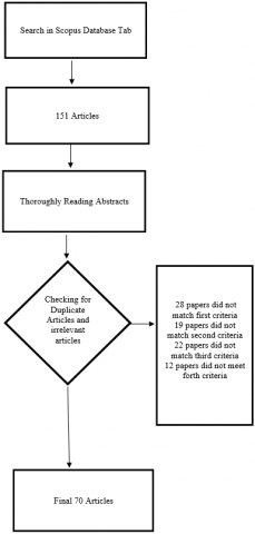 In order to execute a systematic review, the study needs a well-planned approach. Firstly, we focused on the various dimensions of GHRM, in this context we focused on those studies that thoroughly discussed conceptualizations and reflections of GHRM. Secondly, we performed in detail checking of the important applications of GHRM like green training, green rewards and compensations etc. Thirdly we looked for the possible factors of GHRM. Finally, the studies which were performed relating to the effects of GHRM were checked. The figure on the right shows the article selection approach. Important keywords were identified relating to Green HRM and then these keywords were inserted into the Scopus database to get the required results. These keywords include title-abs-key (“green human resource”) OR title-abs-key (“green human resource management”) OR title-abs-key (“green human resource management practices”) OR title-abs-key(“GHRM”). Then the Span was reduced and only articles from 2008 to 2020 were considered. The initial searching resulted in 151 articles. Abstracts of 151 articles were thoroughly assessed to identify relevant literature related to Green HRM. Moreover, we also excluded those works that did not address Green HRM scholarship. We also eliminated those studies that use the word “green” as jargon. Finally, 70 papers were selected based on original contribution and clearly defined objectives. These 70 papers were inserted in excel sheet for further analysis and they were classified according to the research questions discussed above. The Figure 1 below shows the complete methodological process.