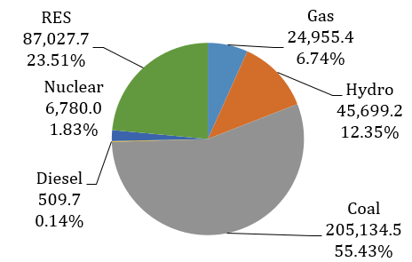 In India, electricity is produced from multiple energy sources. These include coal, oil, gas, nuclear, large hydro, and renewable (solar, wind, small hydro, and biomass) energy sources (RES). As per the Central Electricity Authority (CEA), the total installed capacity in India is 370,107 MW as of 31.03.2020 [3]. Figure 1 shows the installed capacity of various power generation systems. Figure 2 shows the electricity generated from various power generation sources during 2019-20. The total electricity generated is about 1389 billion kWh [3]. The per capita electricity consumption in India is about 1,122 kWh in 2016-17 [3] whereas the world’s per capita electricity consumption as given by International Energy Agency (IEA) was about 3,110 kWh during the same period [4]. This means India’s per capita electricity consumption is just 36% of the world’s average. The share of electricity from coal power plants in India is about 72.8%. Even though the installed capacity is about 56.4%, about just less than 3/4th of the total electricity is generated from coal-based power plants. Coal-based power plants play a significant role in the Indian Energy sector. Coal-based power plants are the backbone for the Indian power sector and this trend will continue in the coming decades. Hence, it is important to study the sustainability of coal-based power plants in India.