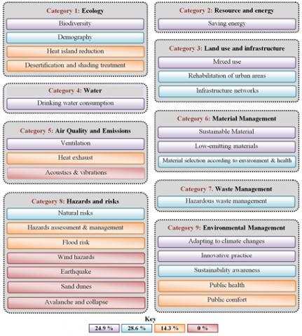 This investigation found that while the assessment tools show a wide coverage of environmental context, disparities are apparent in the scope of the topics that have been covered by the indicators and sub-indicators included in the global sustainability assessment tools. Therefore, many indicators affect the increase of environmental risks and should be addressed. The assessment criteria and certification methods of the mentioned assessment tools have been identified and assigned to nine eco-friendly city criteria: ecology, resources and energy, land use and infrastructure, water quality, air quality and emissions, material management, waste management, hazards and risks, and environmental management (see Figure 13).