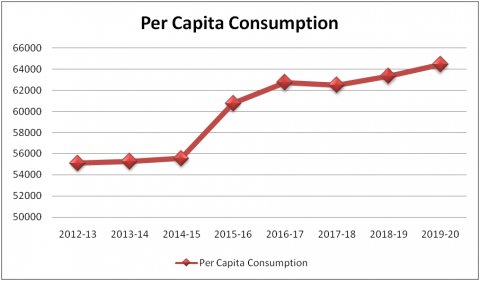 Per capita energy consumption increases year-by-year is shown in Figure 4. In 2012-13, per capita consumption was 55,112.06 kWh. As the year passes electrical energy requirement increases. Now in 2019-20 per capita consumption is 64,432.34 kWh which shows 16.9% increment from 2012-13.