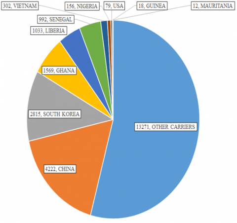 Marine fish exports are an important part of a comprehensive resource management plan. The data presented from FAO and MFMR (Figure 1) reflect that exports are very low and relatively consistent (except for the peak during the civil war), despite the huge increase in fish catch in the recent decades and the discrepancy between the two sources in 2016 and 2019. Data of countries receiving fish exports (Figure 2) reveal principal trade flows, which can be used to advise and develop international trade relations, including determining export quotas. In 2016, China, South Korea, and Ghana were the highest importers of marine fish from Sierra Leone, excluding ‘other carriers’ for which the country was unspecified. These countries were also among the top four in 2019. Though data for economics and development are not presented, analyses beyond the scope of this paper could be performed to evaluate (and maximise) economic benefit of export, division of benefits from government to local communities, and whether export is aiding or hindering development in Sierra Leone or simply satisfying external business and trade obligations and agreements.