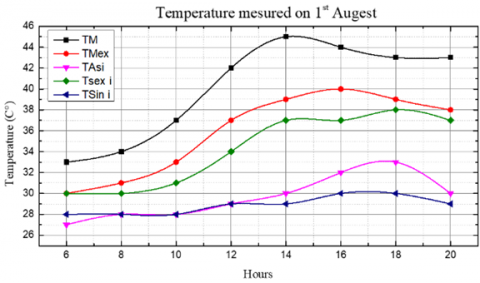 The least important energy needs (see Figure 25A) for air conditioning are those of prototype 3 (Double wall with 5 cm air gap and 2 cm cement plaster) with values that vary between (2100.00 / 2700.00 / 2950.00 /3000.00 KJ / H) which corresponds to hours (5088.00 / 5336.0 / 5584.0 / 5832.0h) and days (1/11/21/31 August). As a result, the findings produced are precise in terms of material optimization with various combinations. The energy required by the double-wall with an air gap is the least, followed by the energy needed for the double-wall without an air gap (prototype2). Following that is the third prototype, which is identical to the last prototype (prototype B of the experiment). Prototype 3 on the day of the 21st is located in the thermal comfort zone of the standard (NF EN 15251) while it has acceptable comfort (less than 26℃) on the 11th (see Figure 25B).