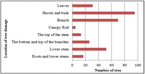 Based on Figure 3, the location of damage that mainly occurred in mangrove forests apart from the shoots and shoots was on the branches as much as 70 (22.65%) damage, lower stems as much as 52 (16.83%) damage leaves as much as 31 (10.03%) and the top and bottom of the branch as much as 26 (8.41%) damage. Therefore, the location of tree damage helps identify the type of tree damage that has occurred because each area of damage has different characteristics or types of damage symptoms.