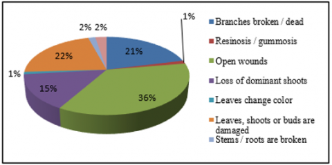 Figure 5. Type of damage: Open wound (a); damaged buds, foliage and shoots (b)