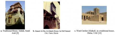 "The idea of sustainability in Islam is not new"; it includes economic, social, environmental, ecological, biodiversity, and human values [4, 7]. Muslims are among their traditions associated with preserving the environment and nature through the creation of societies and social and economic activities, and the environment is similar to the three pillars of sustainability [6, 8]. Islam encourages social relations and establishes rules in dealing with them, social and economic growth through the teachings of Islam zakat, where Islamic economic rules which applied through the Qur'an. Figure 3. It shows the Islamic context and sustainability. (Figure 4. a, b, c) shows the traditional house elements in selected Arab cities, a. Jeddah, b. Cairo; Mashrabiyah, which provide privacy and cool air for the house, and c. The windcatcher (Malkaf) in one of the traditional houses in Dubai provides cross ventilation.