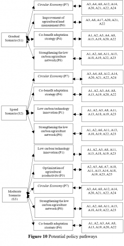 The close relationship between scenarios and policies shows that circular economy policies (P7), improving agricultural land governance (P6), co-benefit adaptation strategies (P4), and strengthening low-carbon agricultural networks (P8) are more relevant in gradual scenarios (S1). In the speed scenario (S2), circular economy (P7), a co-benefit adaptation strategy (P4), low-carbon technology innovation (P1), and strengthening low-carbon agricultural networks (P8) can be implemented. For the moderate scenario (S3), there are five relevant policies, consisting of low-carbon technology innovation (P1), optimization of agricultural productivity (P3), circular economy (P7), strengthening of low-carbon agricultural networks (P8), and co-benefit adaptation strategies (P4).