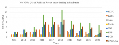 From all analysis and discussions, it is obvious that the GNPAs and NNPAs of all the leading Indian banks were at their highest level in 2018 and starts to decline in 2019 in a period of study 2013 to 2022. This reflects the strengthening of the financial soundness of the banks. The GNPAs and NNPAs of the leading public sector banks are higher than the leading private sector banks. The NPAs govern the NIM and ROA in Indian banks, negatively. The capital adequacy ratio (CAR) in the leading Indian private sector banks is higher than the leading private sector banks. All banks maintain the CAR as per the BASEL III prescriptions and also reserve the capital as per the RBI norms in India. The current account and saving banks account to total deposits (CASA) ratio is increasing slightly in the Indian banking industry. Enhancements of the CASA ratio will play a vital role in strengthening the financial soundness of the banks. The financial soundness of the banks can be maintained by controlling or reducing the NPAs and another hand enhancing the regular income to maintain the reserves or provisions against the hedging from insolvency. The controlling and reduction of the NPAs totally depends on the loan sanctioning policies and strategies, and after that strict governance to recover the loans to avoid the NPAs. Another hand, the banks have to maintain their CASA ratio to enhance the NIM ratio. Hence, there is a need in the leading Indian public banks to enhance the current account deposits and saving banks accounts in total deposits to avail the cheaper funds to the banks for loans and advances. The study is based on the secondary only data obtained from the financial statements and no consideration of the non-monetary factors related to the NPAs. Further, there is scope available to consider the behavioral approach or non-monetary approach to study the NPAs in Indian banks.