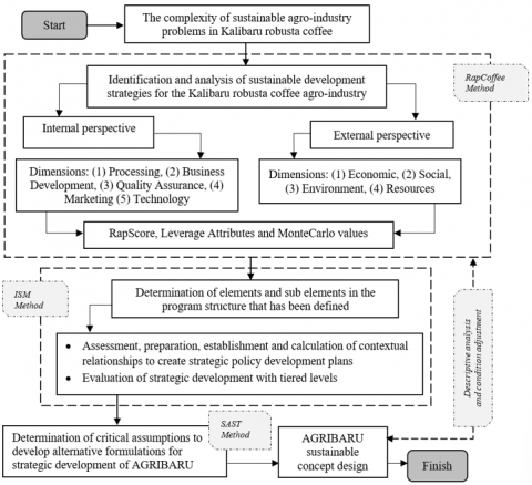 The concept of sustainable design in the Kalibaru robusta coffee agro-industry uses several decision-making techniques, namely Multi Dimensional Scaling hereinafter referred to as Rap Coffee [16-18] identify and analyze the development and complexity of the problem. Robusta coffee agribusiness in Kalibaru, refers to the dimensions of sustainability from an internal and internal perspective, then determines the elements in the established program structure [19], and evaluates strategic development with tiered levels using the Interpretive Structural Model [20, 21], then makes critical assumptions to build alternative formulations with the Strategic Assumption Surface and Testing Method [22] which is preceded by exploration and elaboration of problems using the SSM approach, following the research scheme of Figure 4.
