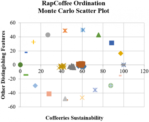 Based on the results of RapCoffee Analysis, the real value of coffee is strengthened by Monte Carlo analysis, the value of sustainability from an internal perspective is better than an external perspective because only one internal dimension falls into the category of almost unsustainable status with a score between 21-40, namely the business development dimension of 31.85. As for the external perspective, two dimensions fall into the almost unsustainable category, namely the social dimension of 35.39 and the environmental dimension with a value of 37.16 as shown in Figure 7.