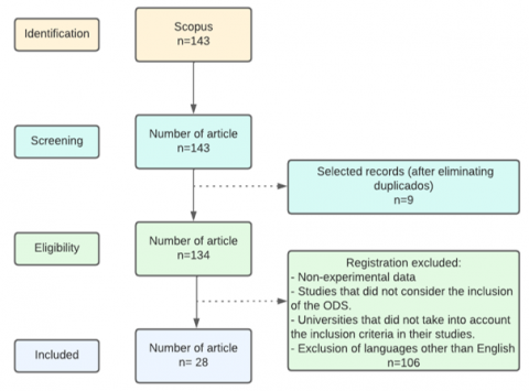 The search was not limited by year of publication and only documents published in English were searched. The search was conducted from 06 to 20 January 2023 and 143 articles were found after applying the search method. From the previously selected articles, the following were removed: a) articles published before 2015, the year in which the 2030 Agenda was launched, b) articles in a language other than English. After applying these selection filters, a total of 28 articles were selected (Figure 1).