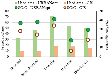 Figure 9 reports a comparison between results with orientation-performance criteria in GIS and URBANopt optimisations, selecting the four residential blocks and adding a hypothesis of mixed residential area. The housing-mix scenario includes one detached, 7 semi-detached houses, 2 low-rises and 4 high-rises and 291 inhabitants overall. The graph reports the share of roof area assessed and the reached level of self-sufficiency. The optimised results in URBANopt are always larger than the identified areas in GIS, especially for multi-family typologies. The GIS evaluation only considers favourable exposures (S-SE) and slopes (≤ 45°) for PV production. On the other hand, block scale simulations optimise PV panels to minimise LCCs over 25 years and balance local production with building energy consumption.