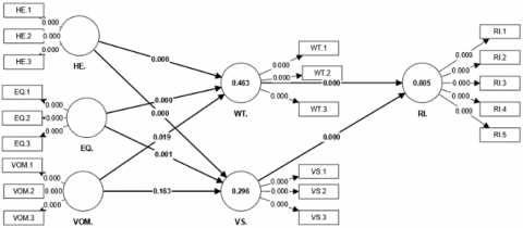 While the Centered VIF value of the Experience Quality, Holistic Experience, Revisit Intention, Visitor Satisfaction, Vivid of Memory and Wow Tourism variables is 1.0000 <10, it can be concluded that there is no multicollinearity problem in the PLS model. After processing the data using PLS-SEM, the Discriminant Validity results obtained using the HTMT method can be seen in Table 2.