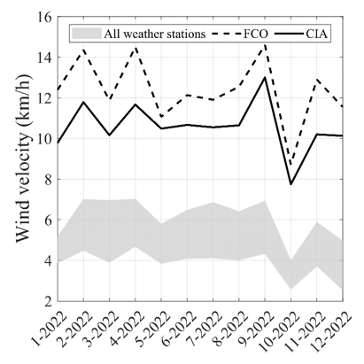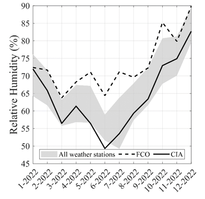 Fiumicino is characterized by higher values than Rome and Ciampino, except for the winter season. In summer, due to the proximity of the sea, the recorded humidity values in Fiumicino are higher than the city, with values ranging from about 65% to 72%. The data recorded in Ciampino and Rome follow the same trend, with minimum values in summer of around 50% and maximum values in winter of around 82% in Campino and 90% in Rome.