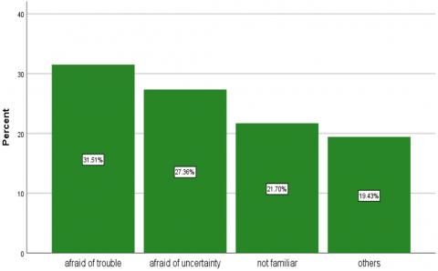 Figure 7 and Figure 8 both are discussing preference in green finance and the answer whether the respondents will choose green finance instruments or not if the return on investment is exactly the same as the time deposit rate. Figure 7 indicates that the majority of the respondents 65.47% prefer green finance which is contrading to the findings of study [6] who finds that majority of the respondents are not sure whether they prefer or not for green finance and only 14.34% they are not preferring green finance. Therefore, this results demonstrate that the vast majority of the respondents prefer green finance which is good indication for the future. Hence, it very crucial for somalis to prefer green finance in order to adopt climate change that effects badly [15]. The Figure 8 also shows that the most respondents are not choosing green finance because they are afraid of trouble 31.51% which is similary to the findings of study [6]. and it followed by the respondents who said they afraid of uncertainty by 27.35%. lastly, not familiar green finance took third position 21.70%. finally, other factors are causing why I am not choosing green finance is only 19.43%. therefore, this study shows that the main reason that respondents are not choosing green finance is because they afraid trouble or uncertainty. The idea of green finance do not exist or new in Somalia that is why majority are afraid or uncertain to use green finance.