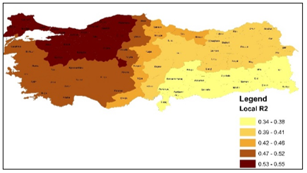 In Turkey, the coefficients of the number of foreign companies, the number of houses sold to foreigners, and incentive certificates issued to foreigners variables positively impact SEGE. However, the spatial distributions vary. International foreign capital mobility affects the socio-economic development level of the cities. The spatial distribution of international population mobility local R2 values differ from the international capital mobility's. According to Figure 10, Figure 11 shows that Eskişehir and Ankara, together with the Marmara and Western Black Sea regions, the regions that are the first two categories of the development index, have higher local R2 values varying between 0.53 and 0.55. On the other hand, Hatay, Osmaniye, and Kilis, together with the cities in the Southeastern Anatolia region where the least developed cities are concentrated, have lower values ranging between 0.34-0.38 (Figure 10). These values show that the model's rate of explaining the relationship between socio-economic development and international population mobility is comparatively lower.