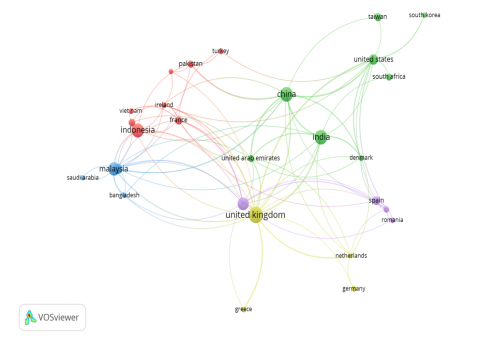 Co-authorship analysis seeks to determine the level of productivity of authors (co-authors) when conducting research and writing activities as single authors and as authors in groups [43]. Bibliometric analysis results for co-authorship analysis with a country analysis unit of at least 5 articles per country. Figure 2 depicts an image of the co-authorship cluster analysis. The author's collaboration with other authors is the focus of this analysis. The analysis displays results based on the author's name, organization, or country of origin. According to the findings of the analysis, the authors' collaboration occurred across borders, resulting in 5 collaboration network clusters in 28 countries. When compared to nodules representing the names of other countries, nodules representing the United Kingdom are the largest. This demonstrates that author collaboration in publishing research findings related to the green economy in SMEs is stronger than collaboration among affiliated writers from other countries.