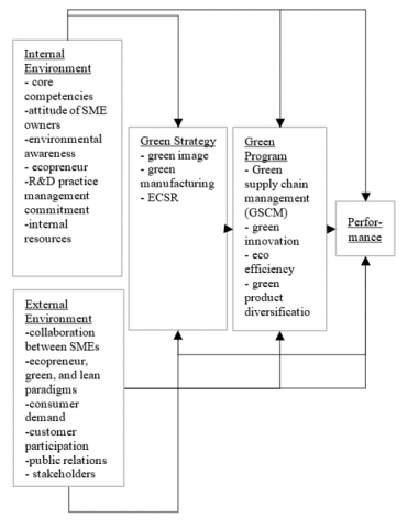 During the final years of this decade (2010-2020), there was a surge in the desire for environmentally friendly products or those that conform to the tenets of sustainability [7, 8]. A company is expected to comply with all standards and requirements, as well as respond to signals from external market stakeholders, particularly the international market [8]. Environmentally friendly products are in high demand not only in large industries, but also in small and medium-sized businesses [9]. Several studies on the concept of SMEs' sustainability have emphasized environmental aspects, such as green products [10], green marketing [11], green supply chain management [12, 13], green innovation [14, 15], and green intellectual capital [16]. However, applying green economy principles to SMEs is still uncommon [17].