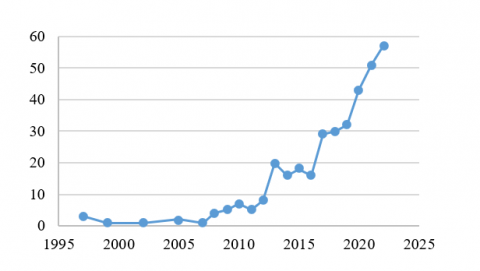 Articles on the green economy in SMEs show an increasing trend over the last 20 years, from 1997 to 2022. According to the data, articles Significant progress has been made in the last three years (2020, 2021, and 2022). Figure 1 depicts the data on article distribution.