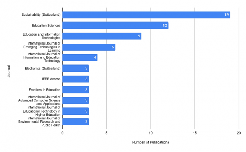 RQ 2 will be answered in this sub-section of the study. Figure 3 shows eleven journals that have at least 3 articles related to the digital transformation of higher education. Based on the selected pool of research in this area, the most significant journal is Sustainability (Switzerland) with a total of 19 publications, followed by the Journal Education Science with 12 publications, Journal Education and Information Technologies with 9 publications, the International Journal of Emerging Technologies in Learning with 6 publications. Understanding which journals are significant is the basis for researchers to find credible sources that are relevant as references for further research.