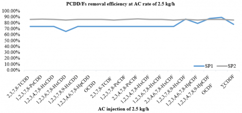 Figure 6. PCDD/Fs removal efficiency at 2.5 kg/h AC injection rate