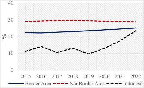 Regarding border areas, Indonesia has seven provinces whose districts are directly adjacent to neighboring countries. West Kalimantan, East Kalimantan, North Kalimantan border Malaysia. Papua, Mountain Papua, South Papua borders Papua New Guinea and East Nusa Tenggara borders Timor Leste. Like most border areas in other countries, Indonesia's borders also have quite complicated problems. In fact, the condition of Indonesia's land borders is still lagging when compared to non-border areas, especially for regions that are already underdeveloped [18]. During 2015-2022, the GDP per capita of border communities was recorded lower than that of non-border areas in the seven provinces. Although there was an increase in 2021-2022, the increase has not been able to match non-border areas (Figure 1 (a)). On the bright side, border poverty is lower than non-border areas, but still quite high compared to Indonesian poverty. This is thought to be because borders are rural areas, where poverty is lower, and non-border areas are urban areas with generally higher poverty (Figure 1 (b)).