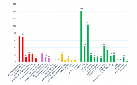 Poor indoor air quality is linked to heightened health risks and a decline in productivity and overall well-being. Inconsistencies and uncertainties have been identified in the application of the IAQ index, and that is because there are various methods for evaluating health risks and well-being, and research plans often show different Exposure Limit Values (ELVs) for Indoor Air Quality (IAQ) parameters. Additionally, research frequently overlooks complex factors such as additional IAQ parameters, building characteristics, and occupant behaviors, as well as variables like contaminant concentration. Most importantly, there is a lack of a comprehensive, global standard or guideline for IAQ and ELVs across different indoor environments. However, the most used sub-indicators for IAQ assessment in research are CO2 (ppm) and PM10 (µg/m³) are the two most commonly used, followed by other sub-indicators such as PM2.5 (µg/m³), CO (ppm), TVOC (µg/m³), HCHO and NO2 [24, 25].
