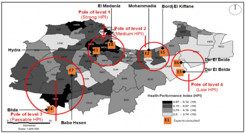 The participants came from seven municipalities in Algiers. The spatial distribution of residence places of the households consulted represents the four poles of health performance at different levels, identified by the HPI (Health Performance Index) [21] (Figure 1). HPI draws for Algiers the most efficient municipalities, but also shows that, need the urgent implementation of a strategy prospective improvement of health performance by setting up resilient urban health planning to pandemics.