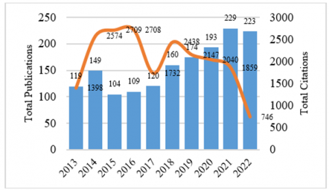 The development of publications and citations are presented through the combination of a blue bar chart and an orange line respectively in Figure 2. It was observed that the number of publications tended to increase from 2013 to 2022 but there was a decline in 2015. Meanwhile, the number of citations fluctuated significantly as represented by the continuous decline from 2019 to 2022 and a peak of 2,709 and 2,708 in 2015 and 2016, respectively. The trend further influenced the citations in the following year. The decline recorded possibly showed that despite the increasing diversity in water pollution research, there was a risk of the results not being fully integrated into the broader scientific discussion. This can reduce the visibility and influence of water pollution research and limit the scientific and practical impact on environmental policy development. The inference was that the increasing research focus was possibly followed by suboptimal effectiveness and contribution to knowledge and development of solutions to address water pollution issues.