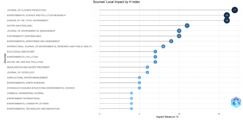 The contributions of journals were not based only on the quantity because the impact was found to be more meaningful. This was calculated using the h-index of each journal that published articles related to water pollution theme. The results are presented in the blue bar chart presented in Figure 5.