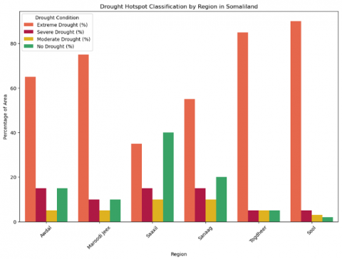 Figure 11 presents a comprehensive classification of drought hotspots across six regions in Somaliland: Awdal, Maroodi Jeex, Saaxil, Sanaag, Togdheer, and Sool. This bar chart offers a comparative analysis of the percentage distribution of areas experiencing extreme, severe, and moderate drought conditions and areas with no drought. The data reveals stark regional disparities in drought severity. Sool and Togdheer emerge as the most critically affected regions, with 90% and 85% of their areas under extreme drought conditions, respectively. Maroodi Jeex follows closely, with 75% of its area experiencing extreme drought. In contrast, Saaxil stands out with the lowest percentage of extreme drought at 35% and, notably, the highest proportion of drought-free areas at 40%.