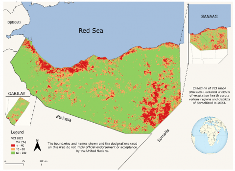 A prominent observation from the map is the extensive presence of green areas, indicating that a significant portion of Somaliland experienced high vegetation cover in 2023. This distribution suggests favorable environmental conditions and effective land management practices, contributing to robust vegetation growth across the region. However, the map also reveals notable variations in vegetation cover, highlighting the spatial heterogeneity of environmental and anthropogenic factors influencing vegetation health. Moderate vegetation cover, represented by yellow areas, is scattered throughout the region, suggesting localized areas where vegetation health is moderately stressed. These regions may be experiencing varying degrees of environmental or human-induced pressures, impacting vegetation growth and productivity. Conversely, areas with low vegetation cover, depicted in red, are predominantly concentrated in the eastern and southeastern parts of Somaliland and certain districts highlighted by the inset maps of Gabilay and Sanaag. These red zones indicate significant vegetation stress, likely attributable to drought, overgrazing, deforestation, or other forms of land degradation.