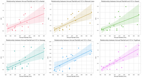 Figure 8 presents the relationship between annual rainfall and the VCI across six regions in the study area: Awdal, Maroodi Jeex, Saaxil, Sanaag, Sool, and Togdheer. The scatter plots effectively illustrate the correlation between these two variables, with fitted regression lines and confidence intervals providing insights into the strength and reliability of the relationships.