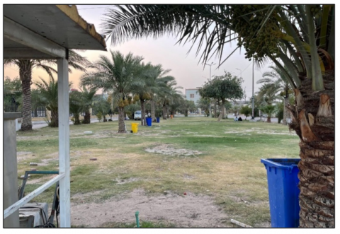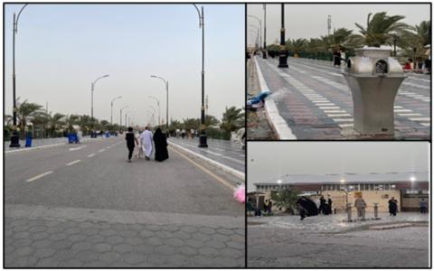 From the site observation form for the Urban Furniture Index, it can be noted that some of these elements are already available, such as trash cans, potable water devices, signboards, lighting poles, and environmentally friendly sidewalks. As in Figure 10, these elements contribute to improving environmental cleanliness and providing guidance and lighting in public spaces. However, there is a lack of many other elements that are necessary to make public spaces more attractive and usable. For example, there are no benches for sitting, which reduces the comfort of users and the possibility of them staying for long periods in the place. Or replacing sitting on the grass, which may damage it, shade umbrellas, children's playgrounds, water fountains, and food and beverage kiosks means that these spaces may be less interactive and less sustainable, which affects their attractiveness and use by individuals.