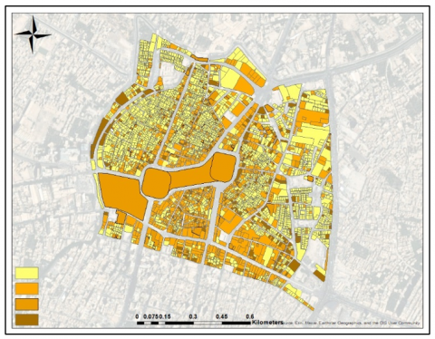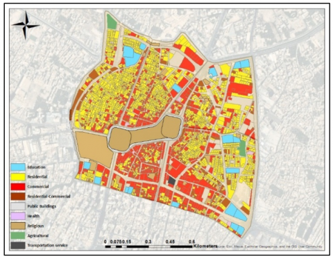 Residential use: The residential use of the land covers about 40% of the traditional urban fabric of the old city. The population of the old city is about 12,360 people for the year 2024 (see Table 1). The residential areas extended very close to the outer walls of the two shrines. However, due to the demolition of the city center after 1991, the wide square between and around the two mosques separates these areas from the two mosques. These residential areas generally lack essential supplies such as maintenance and restoration [47] (Figure 9).