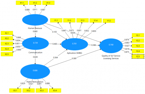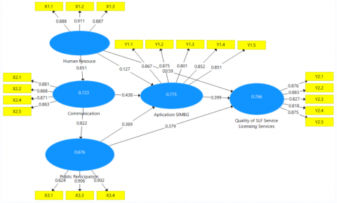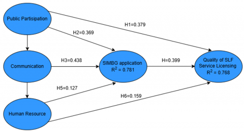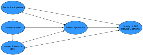 Figure 1 illustrates the interconnected factors influencing the Quality of SLF Service Licensing, with Public Participation, Communication, and Human Resources (HR) playing key roles in enhancing the SIMBG Application as a mediating variable. Public Participation directly impacts the adoption and efficiency of SIMBG, which improves licensing quality. Communication serves a dual function by directly influencing the SIMBG Application and acting as a bridge between Public Participation and HR, ensuring better coordination and understanding. HR (Human Resources) also plays a crucial role in improving both the SIMBG Application and the overall Quality of SLF Service Licensing, emphasizing the need for skilled personnel to facilitate digital processes. The SIMBG Application acts as a central mechanism that integrates these factors, streamlining licensing procedures and ensuring regulatory compliance. This model highlights that enhancing public engagement, strengthening communication, and investing in HR development can significantly optimize digital applications like SIMBG, ultimately leading to a more efficient and effective SLF licensing system.