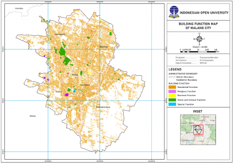 Figure 3 is a building function map of Malang City created by Universitas Terbuka, showing different land-use functions. The legend categorizes buildings into residential, religious, business, social/cultural, and special functions, each represented by distinct colors. The map also delineates district and subdistrict boundaries, providing an administrative overview. The inset map places Malang in a broader geographic context. This map serves as a valuable tool for urban planning, zoning regulations, and infrastructure development, helping policymakers and stakeholders make informed decisions regarding land use and city expansion.