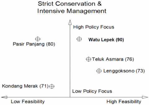 The classification of these sites based on feasibility and policy focus is visually represented in Figure 3. The X-axis in the figure denotes feasibility, with lower feasibility sites positioned on the left and higher feasibility sites on the right. The Y-axis represents policy focus and intervention intensity, moving from lower intervention at the bottom to stricter conservation measures at the top. Watu Lepek, with the highest feasibility score (96), is positioned in the upper-right quadrant, indicating both high development potential and a need for intensive conservation management. Similarly, Teluk Asmara (76) and Lenggoksono (73) also fall within the high feasibility zone but require moderate conservation efforts. Pasir Panjang (80) appears on the left, signifying its high conservation priority despite moderate feasibility, while Kondang Merak (71) is situated in the lower-right quadrant, indicating a need for basic infrastructure improvements before higher conservation measures are implemented.
