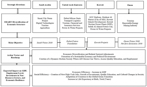 Research on diversification indicators in resource-rich countries is often limited to analyzing resource dependence metrics, frequently overlooking social, political, and cultural aspects [6]. Therefore, an expanded approach to studying this issue is necessary. The aim of this research paper is to develop and justify a SMART diversification strategy for the development of Arabian Peninsula countries based on an analysis of their current national economic structures, global oil prices, and selected transformation strategies. The research objectives include examining contemporary approaches to the relationship between the availability of natural resources and economic development, as well as identifying theoretical gaps in addressing this issue. Furthermore, a more in-depth analysis is conducted of the institutional, political, and social aspects of resource dependence in the development of Arabian Peninsula countries and the leading directions for diversifying national economies. The analysis of the development of these countries encompasses a comprehensive set of demographic, economic, and social growth indicators. These indicators are utilized in conducting correlation and regression analyses to construct a model that assesses the dependence of these countries' economies on global oil prices and to forecast various scenarios for their future prospects.