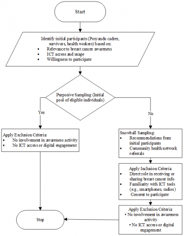 To enhance transparency in the participant selection process, a flowchart was developed to visualize each stage of sampling and eligibility screening. As illustrated in Figure 1, the study began with purposive identification of key informants based on their relevance to breast cancer awareness efforts and familiarity with ICT tools. Subsequent participants were identified through snowball sampling, involving referrals from initial respondents within community health networks. All individuals underwent screening based on defined inclusion and exclusion criteria to ensure data relevance and alignment with the study objectives. The final sample consisted of 23 participants who met all eligibility requirements and provided informed consent.