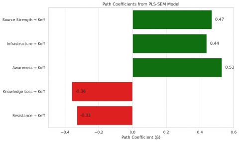 To further validate the conceptual model proposed in this study, a PLS-SEM analysis was conducted using SmartPLS software and simulated data. This model aimed to quantify the influence of five key latent variables Source Strength, Infrastructure Access, Awareness and Engagement, Knowledge Loss, and Resistance on the effectiveness of knowledge dissemination (Keff). Figure 3 below illustrates the resulting path coefficients, showing the strength and direction of influence each construct exerts on Keff.