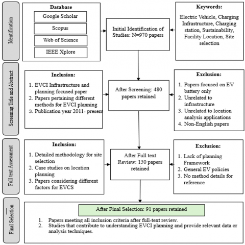 Systematic literature review was conducted using a four-step approach, The process involves formulating review questions, identifying relevant literature based on inclusion and exclusion criteria, selecting studies for review, extracting and analysing data, and interpreting the results for dissemination. To address the research questions, we searched several databases for research published between 2011 and 2024 related to the EVCI location problem. Following a thorough evaluation of the models used in each study, as well as the methods for selecting variables and ranking alternative locations, we selected 96 papers for inclusion. The steps to carry out this review comprise of identification, screening of titles and abstracts, full-text assessment, and final selection as given in Figure 2.
