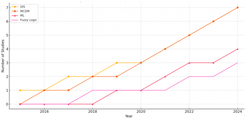 From Figure 8, GIS and MCDM techniques dominate the literature, while machine learning approaches are gaining momentum. Figure 6 presents a timeline of methodological adoption from 2015 to 2024, showing a steady rise in the use of MCDM and a more recent increase in machine learning applications, highlighting a shift toward data-driven decision-making frameworks.