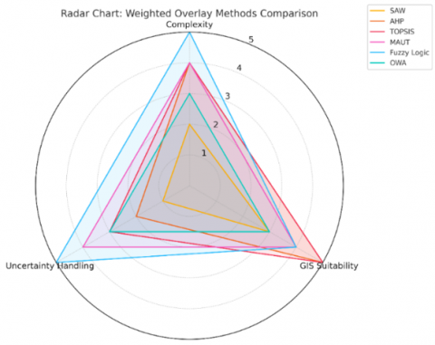Figure 7. Radar chart for weighted overlay analysis methods comparison. The comparison highlights differences in complexity, suitability for GIS-based integration, and ability to handle uncertainty. Methodologies are synthesized from multiple sources [1, 7-25]
