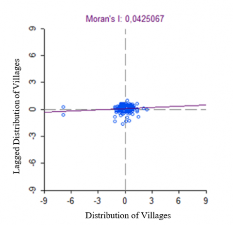 Figure 3. Moran's Scatterplot of the distribution of areas in the prospective new autonomous region of North Sukabumi Regency that could become centers of economic growth