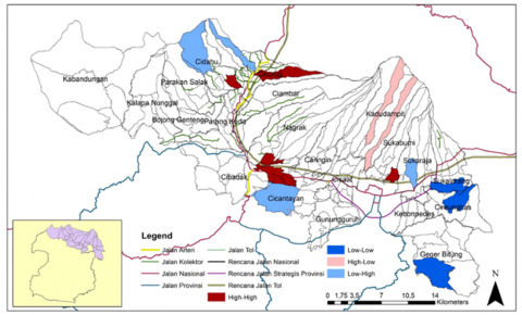 The area unit that has the most complete type and number of public facilities will be the center or the first in the hierarchy compared to other areas. Conversely, if an area has a low number of facilities then the area is a hinterland or back area of the regional unit that is the center of growth. Based on the results of the scalogram analysis where accessibility and facilities are the variables determining the hierarchy of the economic growth center area, it is found that there are 22 villages included in 1st hierarchy. Meanwhile, based on the LISA Cluster Map in Quadrant I (High-High), there are five villages, namely Karang Tengah, Balekambang, Nanggerang, Babakanpari and Sukajaya. These villages have the potential to become centers of high economic growth and are surrounded by other villages that have the potential to become centers of high economic growth as well.